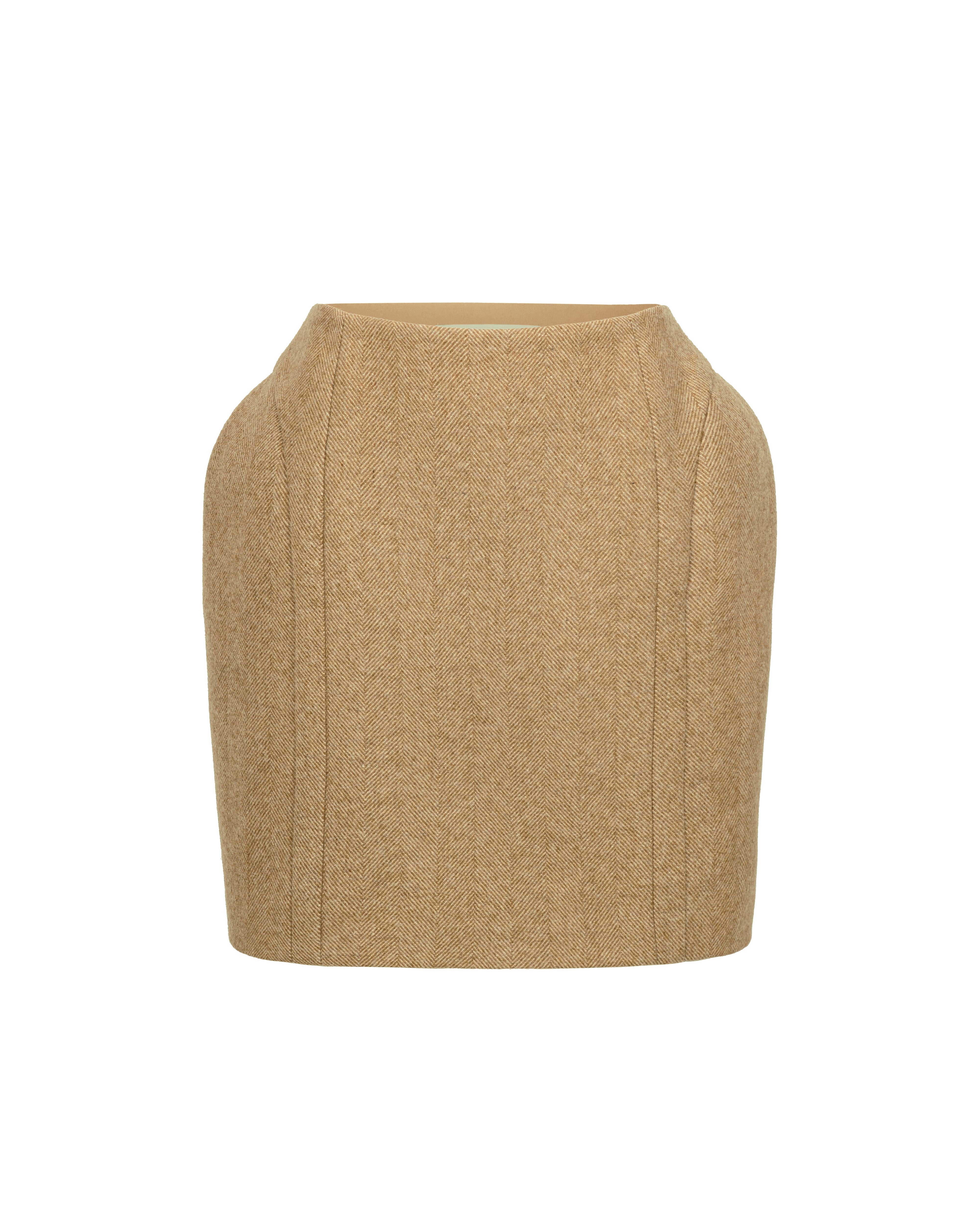 Спідниця зі 100% вовни у делікатну молочну «ялинку», побудована на принципі стабільного об'єму — вертикальні рельєфи витягують силует і створюють плавність у зоні стегон за рахунок «повітря» між тілом і тканиною. Це міні, яка зберігає інтелектуальну стриманість: достатньо коротка, щоб відкрити ноги, але достатньо структурна, щоб виглядати статусно. Конструкція продумана так, що виріб не деформується при сидінні — форма завжди повертається на своє місце. Разом із жакетом формує сильний, дисциплінований силует, де кожна деталь працює на вертикаль.