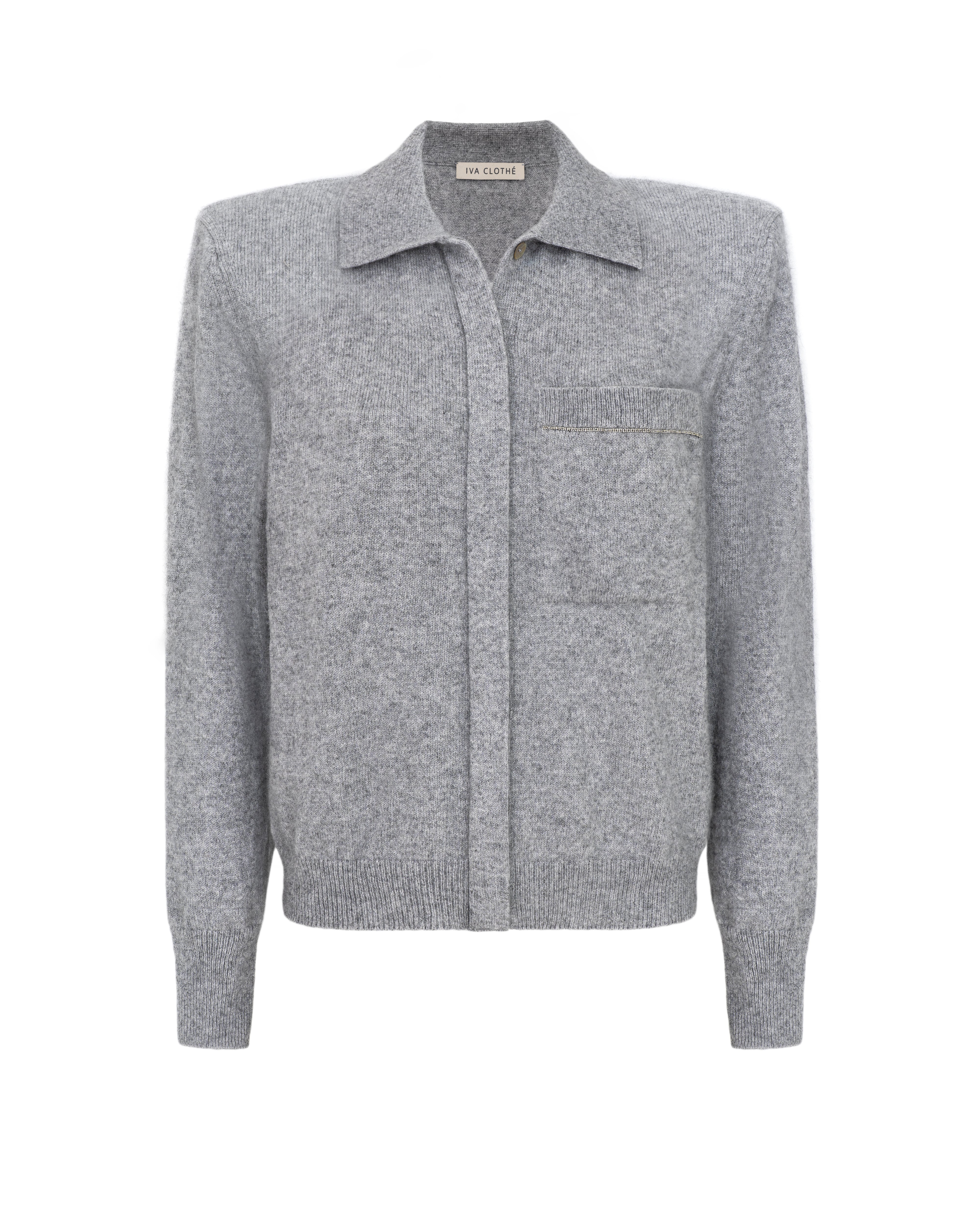 Характерна деталь — сорочковий комірець і супатна застібка з прихованими ґудзиками, зберігаючи чистоту ліній і візуальну акуратність. На грудях — одна витончена кишенька з металізованою срібною манілою, що додає акценту.
