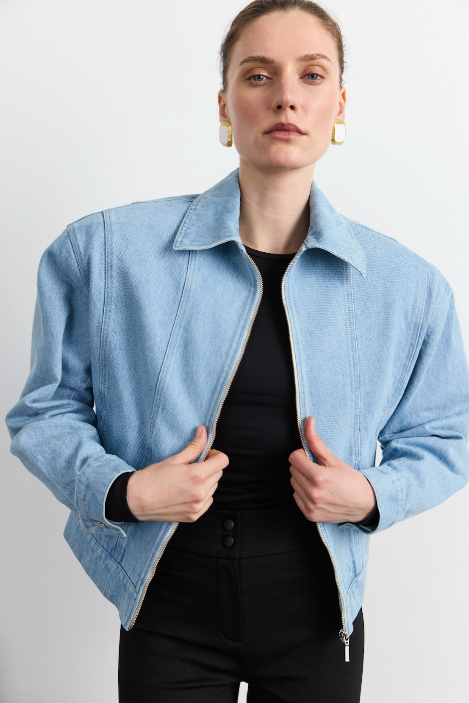 Втілення деніму у його найвищому архітектурному прояві — сформований денім високої щільності працює як повноцінний верхній шар, тримаючи форму, яка не змінюється під впливом руху. Колір — результат виварювання темно-синього полотна до стану холодного Ice Blue з делікатними контрольованими потертостями. Укорочена довжина ідеально збалансована для роботи з високою посадкою штанів або жіночними сукнями, а перебільшений спущений плечовий пояс додає грайливості. Лаконічний сорочковий комір та мінімалістична срібна фурнітура працюють як холодний інтелектуальний акцент.
