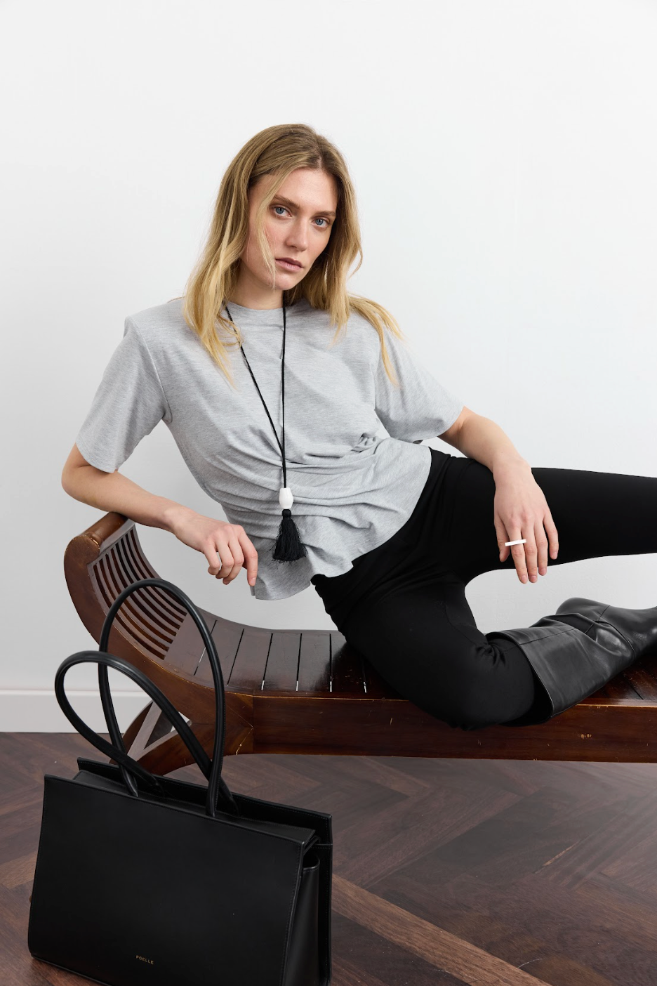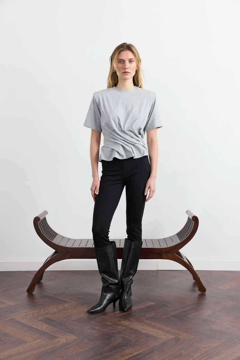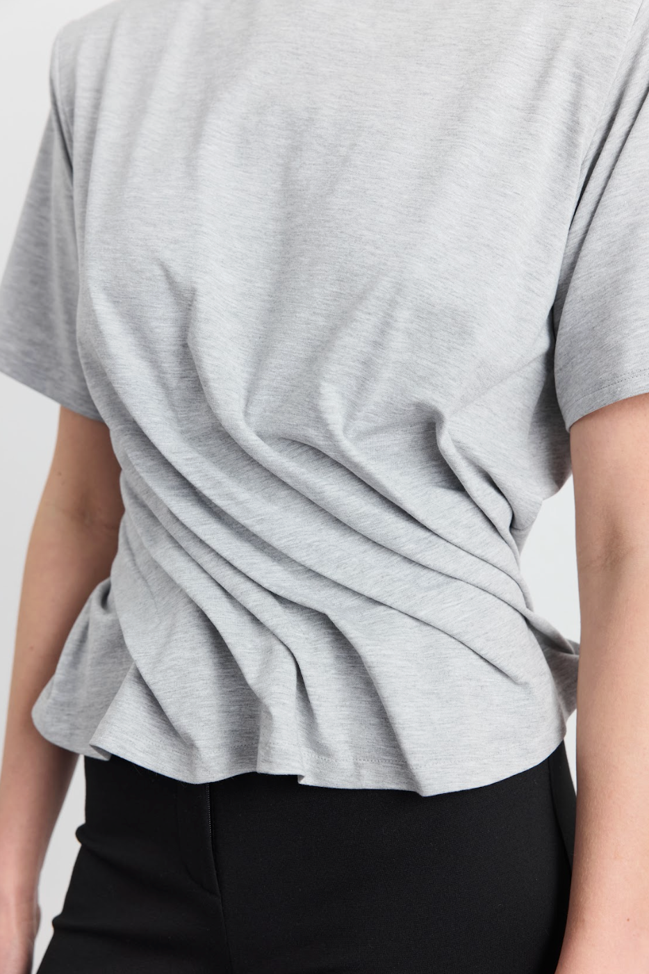 Модель, що переосмислює уявлення про футболку, перетворюючи її на архітектурний об'єкт — спеціально розраховані защипи та складки у зоні талії надають виробу скульптурної форми, що моделює силует. Ідеальний баланс між вільним оверсайз-верхом зі спущеною лінією плеча та зібраним, структурним низом. Складки створюють динамічний ритм, футболка тримає форму, не облягаючи тіло, а створюючи навколо нього витончений каркас. Доступна у чотирьох кольорах: білий, чорний, сірий та блакитний.