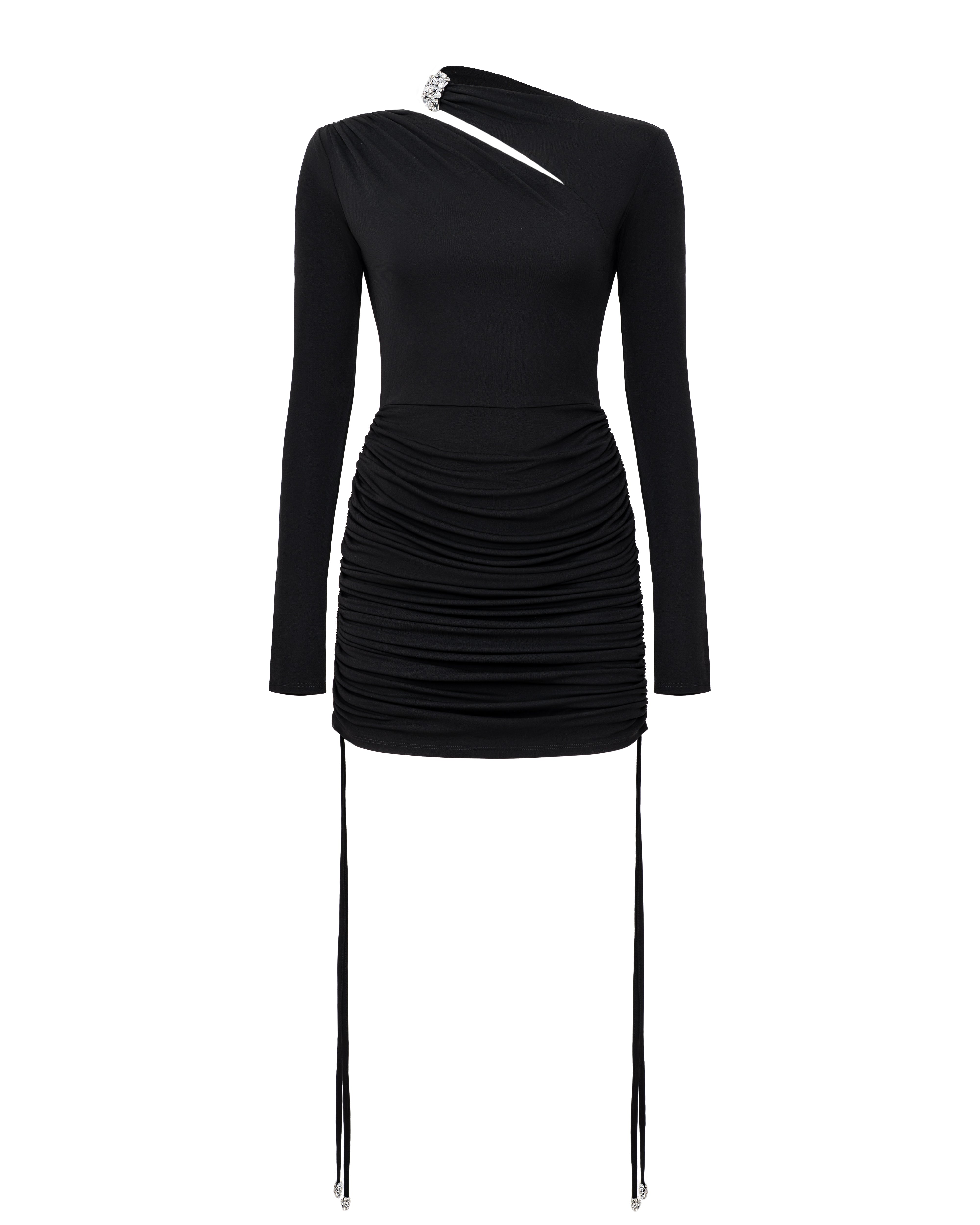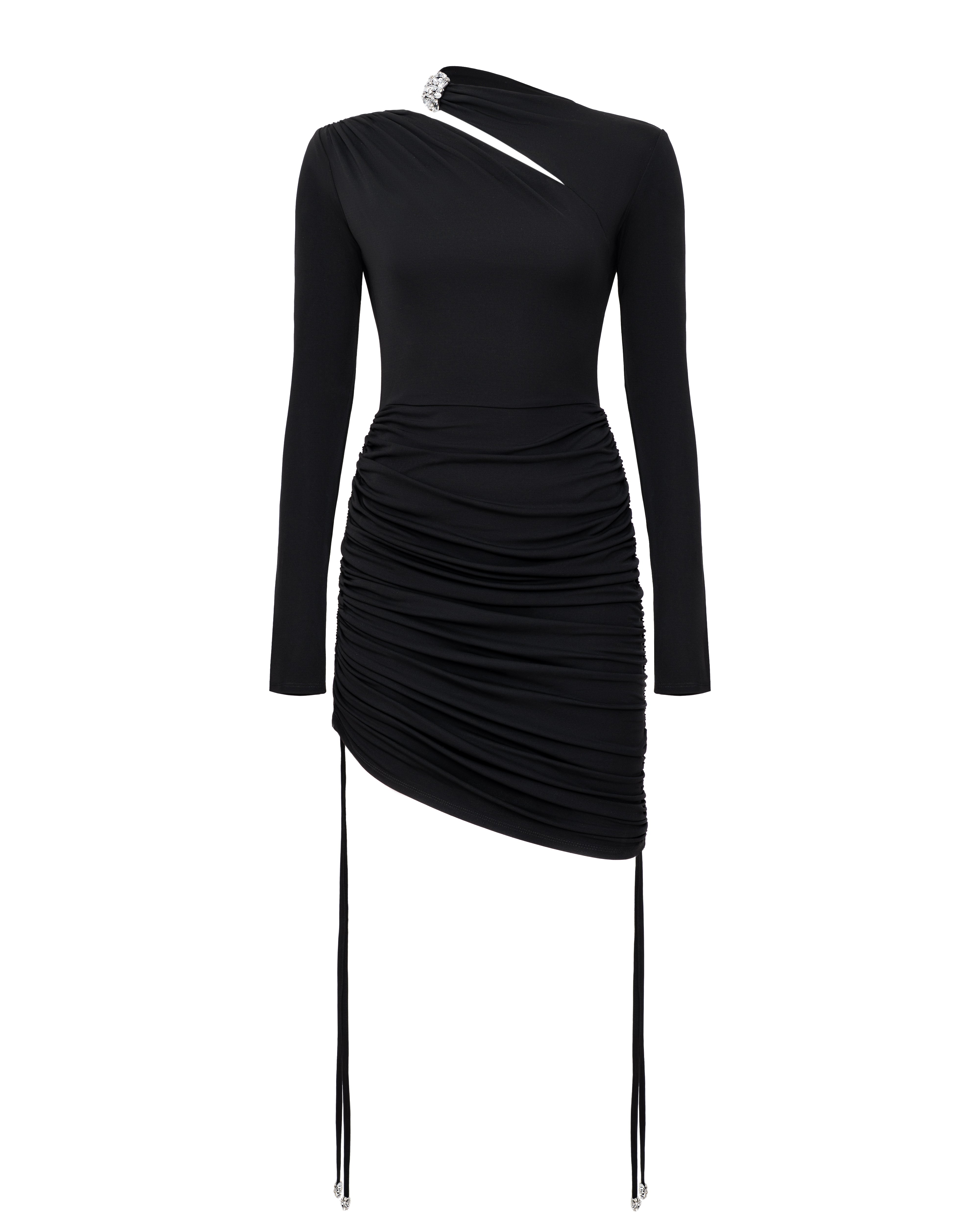 У цієї сукні є власний темп: вона створює ту особливу паузу, коли жінка входить у простір повільно, дозволяючи поглядам зафіксувати кожен рух. Фактура полотна, геометрія ліній та спосіб, у який матеріал реагує на пластику тіла, формують образ, що залишає слід.