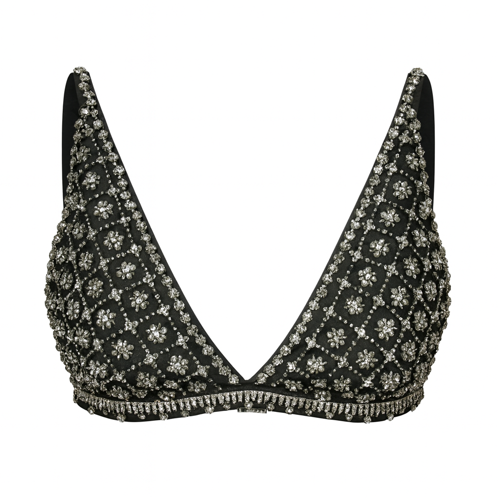 Топ, інкрустований вручну розміщеними камінцями, працює як світлова магія: кожна грань вловлює промінь і повертає його у м’якому, спрямованому сяйві. Це те саме сяйво, яке формує на тілі графіку руху та створює те саме відчуття сцени всередині кадру.