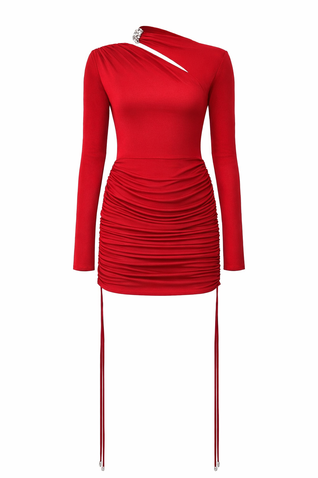 Силует повторює архітектуру чорної моделі, але характер має зовсім інший. Асиметрія верху формує чітку геометрію, що лягає на тіло впевненою, скульптурною лінією. Драпірування на плечі рухається плавно, створюючи внутрішню динаміку. Акцент на шиї працює як світловий штрих, що підсилює колір і додає святкового сяйва, але залишає образ у зоні виваженої елегантності.