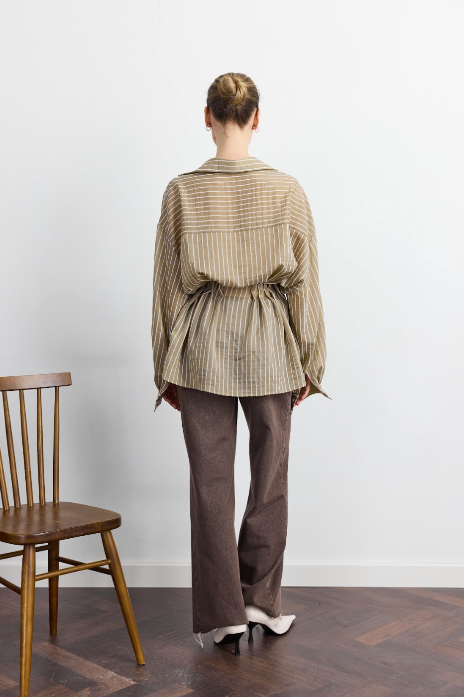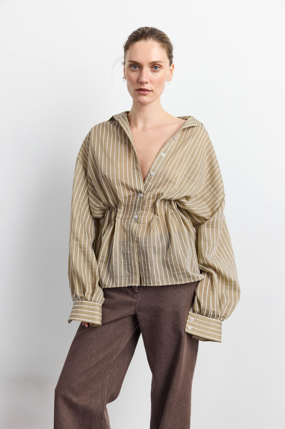 Ключовий візуальний акцент колекції: об'ємний невагомий верх із вільною спинкою та спущеною лінією плеча зустрічається з акцентованою талією через тонку гру защипів. Широкий купольний рукав завершується акуратним високим манжетом, створюючи красивий перепад об'ємів. Блуза дозволяє грати з настроєм: носити стримано або грайливо приспустити з одного плеча. Оливковий відтінок у поєднанні з тенселом має делікатний мікро-шиммер, що оживає при кожному русі, нагадуючи гру світла на листі.